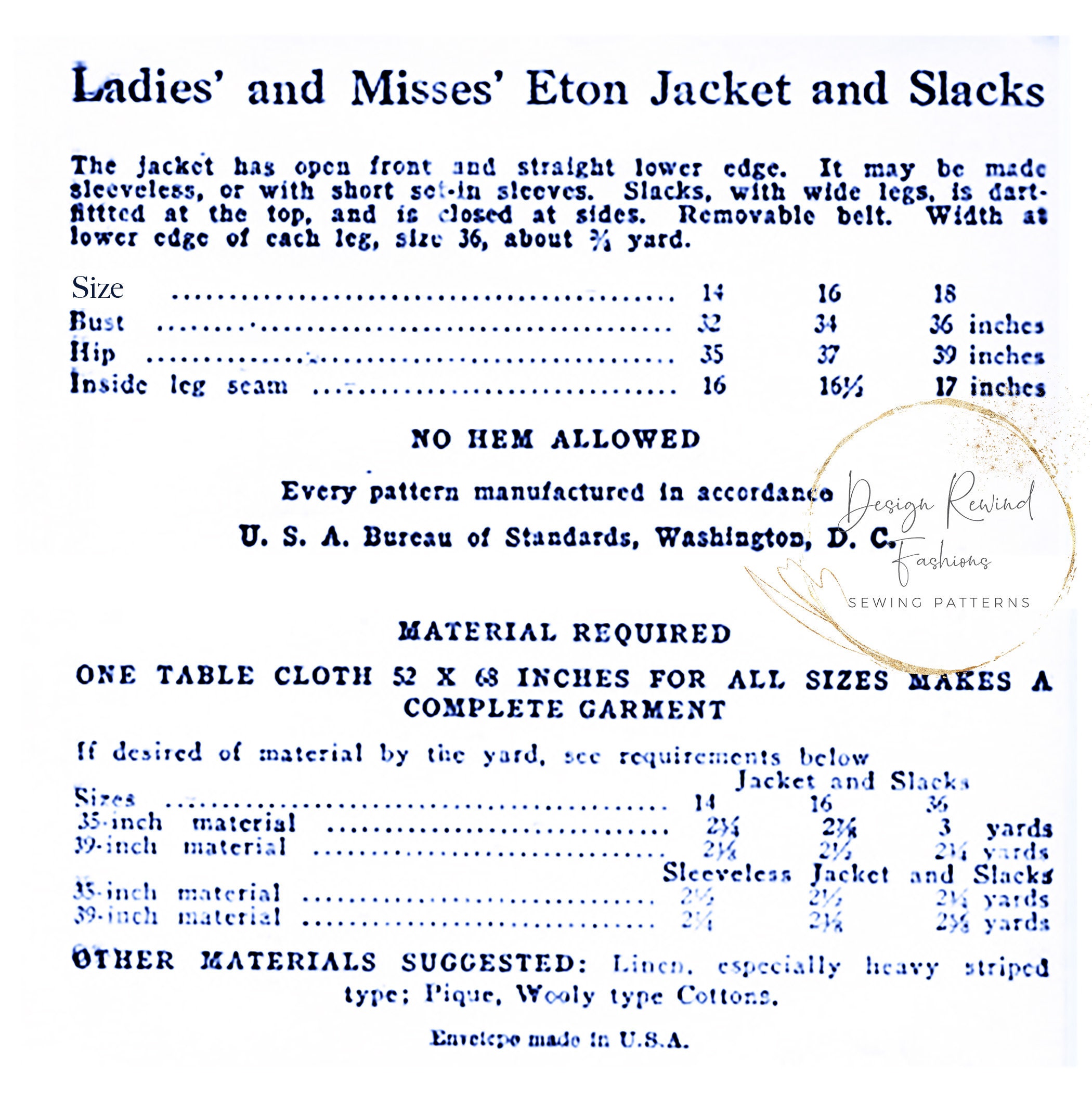 Buy 1930s Vintage Sewing Pattern 30s Eton Jacket Pants Trousers Online In India Etsy